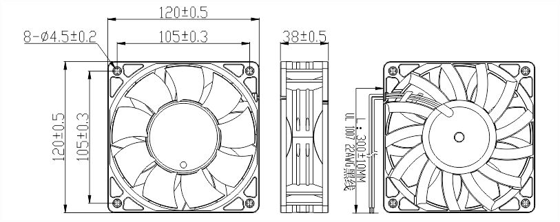 EC軸流散熱風(fēng)扇12038A安裝尺寸圖紙: